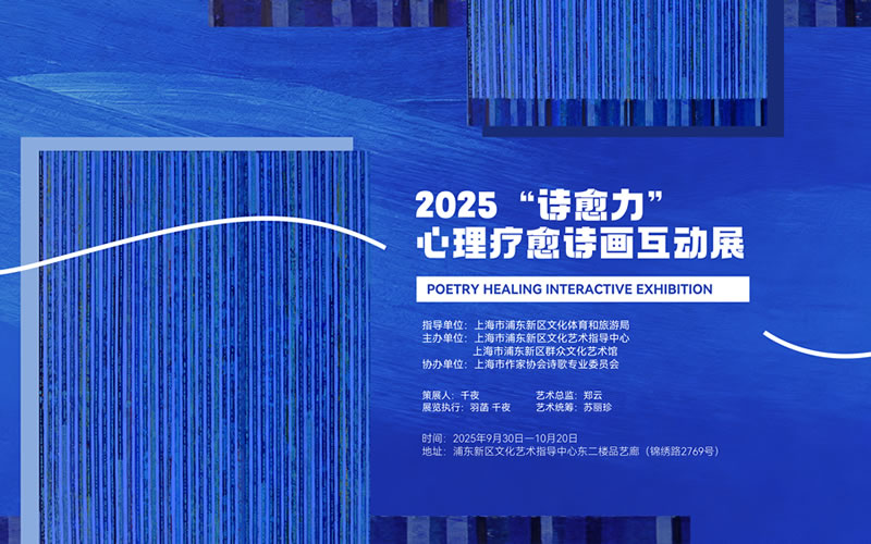 展览信息 指导单位: 上海市浦东新区文化体育和旅游局 主办单位: 上海市浦东新区文化艺术指导中心 上海市浦东新区群众文化艺术馆 协办单位: 上海市作家协会诗歌专业委员会 策展人:千夜 展览执行:羽菡 千夜 艺术总监:郑云 艺术统筹:苏丽珍