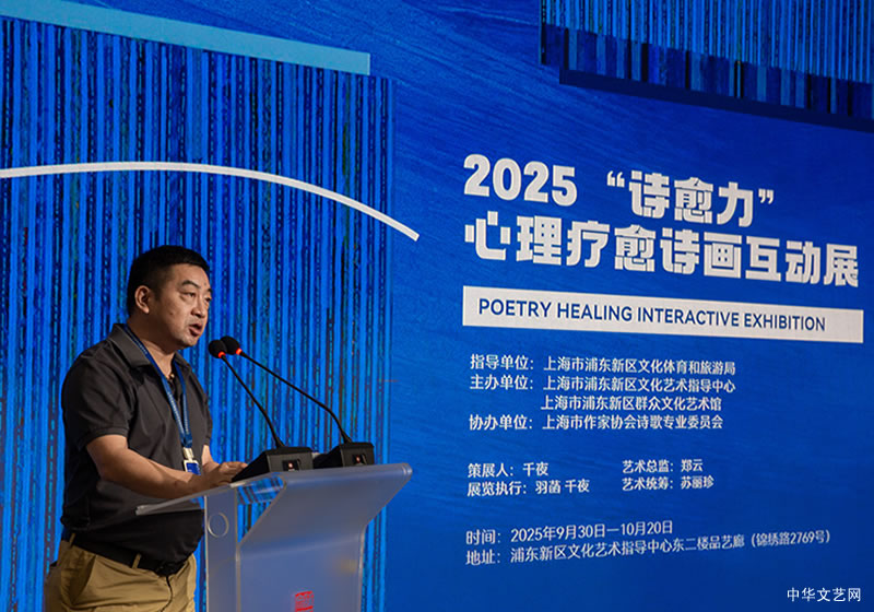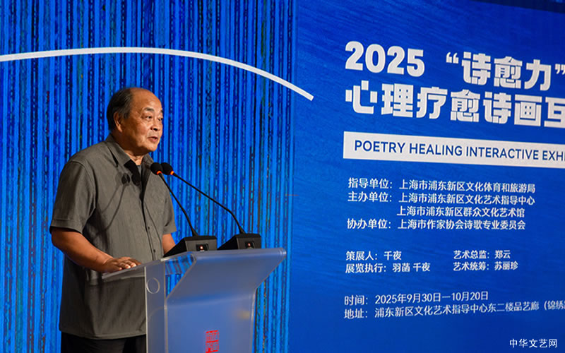 从诗意到画境:多维视角下的疗愈共鸣 别具匠心的开幕式,始于一段沉浸式的“音声疗愈”专场。由音疗师望静静引导。在悠扬的频率与共振中,来宾们首先收获了一份直达心灵的礼物。 著名诗人、散文家赵丽宏先生从切身的音疗体验谈起,指出即使没有文字,宁静与冥想本身已构筑出诗意的境界。他阐述,诗歌是“心灵的秘密”,真正的诗人能将这些秘密化为文字,走入他人内心引发共鸣。在他看来,本次展览正是一种新颖而富有想象力的创新,“它以片段式的诗歌打动人心,实现了精神疗愈”,并强调“真正富有生命力的创新根植于真诚与美”,期待展览能成为文学走向大众的新渠道。 海上画坛名家乐震文先生则从绘画创作的本体出发,分享了他近六十年艺术生涯的感悟。他认为绘画与诗歌一样,终需“扔掉技法”,回归孩童般的纯真观察。他结合每日跑步中“放空”的实践,阐释了放下负担、回归本心对激发艺术灵魂的重要性。由此,他高度赞赏本次展览构建的新颖疗愈空间,认为这种可触摸、可沉浸的体验为观众带来了全新感受,并期待如此温暖而创新的艺术实践能走向更广阔的公共空间。 浦东文化艺术指导中心专职副书记毕震钧在致辞中,从公共文化服务的层面进行了总结与展望。他指出,“诗愈力”展览通过诗画与装置的交互,成功构建了一个创新的艺术疗愈空间,旨在为公众提供心灵栖息地。他强调,将艺术疗愈融入公共文化服务是未来的重要方向,致力于让文化服务在保有品质的同时,更具温度与深度,并随后正式宣布展览开幕。 从观看到走入:一场身体在场的疗愈 来宾们在策展人千夜的引导下移步展厅,开启“观察-接纳-释放”的疗愈之旅。千夜在导览中阐述了策展核心理念:希望打破艺术被动观赏的惯例,让诗歌与绘画成为可触摸、可交互的疗愈工具。“这不仅是一场展览,更是一次引导公众自我对话、安顿内心的情感实践。” 这一理念在核心互动装置“诗歌药局”中得到体现。观众通过转动“情绪转盘”指针、抽取专属“诗歌处方”的仪式,完成一次自我情绪的“诊断”与“疗愈”。上海市作家协会诗歌专业委员会副主任杨绣丽评价道,展览实现了诗歌从平面阅读到立体感知的创造性转化,“‘诗歌药局’让诗歌的社会功能超越了文学范畴,成为一种即时、温暖的情感支持,这是诗歌回归大众、服务心灵的生动例证。” 主持人:羽菡 策展人:千夜