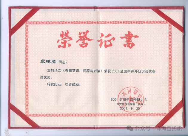 典籍外译研究学科方向的形成和发展 卓振英 典籍外译赋予典籍以新的生命形态与生存空间,有助于提高民族文化活力和东西方文明的融通互鉴,是“为天地立心,为生民立命,为往圣继绝学,为万世开太平”的伟业。开展典籍外译顺乎历史潮流和时代诉求,可谓顺天承命。 中国学者和外国汉学家翻译中国典籍的历史悠久。有的译者也会在前言或后记中谈及自己的体会和感想,但零星而不成体系。 我本人乃芸芸众生之中一名普通教师,既无足踏政、学两界的本领,也无身兼地、校多职的才干,只不过忽闪过一抹思想火花而已。我在2001年9月初向汕头大学校长办公会议提出建立典籍英译研究中心的建议,建议得到采纳,9月21日中心成立。 右起:科研主管校长吴光国教授、文学院院长于贤德教授、研究中心主任卓振英教授 9月23日,我在全国中译外研讨会(西安,2001)宣读与会论文“典籍英译:问题与对策”。论文提出的对策之一便是建立全国典籍英译研究会。 为了建立全国性研究团体,我给校长办公会议和中国英汉语比较研究会打了报告,同时努力取得刘重德教授(中国英汉语比较研究会首任会长)、杨自俭教授(中国英汉语比较研究会会长)、潘文国教授(英汉语比较研究会副会长)等学术界知名人士的支持。 2002年全国典籍英译研究会成立,汪榕培、卓振英、李正栓分别当选会长、副会长。根据杨自俭教授的提议,会议决定编撰论文选,由汪担任主编,由卓担任副主编,由李担任执行主编。嗣后卓振英被排挤在编撰人员之外,论文集没有收录其与会论文“典籍英译:问题与对策”。不过论文于2002年在某刊物公开发表,其引用率不低。 2002年卓振英当选中国英汉语比较研究会常务理事,兼任英汉语比较研究会新建立的典籍英译学科组(后改称典籍英译学科委员会)副组长。 二十几年来,看到青年学者茁壮成长,看到典籍外译蔚为大观,看到一个全新的学科方向从成形到发展壮大,看到自己的思想和策略因享有天时地利人和而得以在全国推行,任何来自学术宗派主义的屈辱、钳制、排斥和边缘化所产生的不快都烟消云散。上善若水、利物不争是人生的最高境界,朝着这个方向迈出的每一步都将获得灵魂得到净化和升华的幸福感,这种幸福感不是权势、地位、金钱所能换取的。 新时期的典籍外译是经世致用治学理念的体现,它毕竟是中国翻译史绕不开的一页,但何人写史、如何治史尚未可知。兹提供若干史料碎片,抑或有助于有关人士之明鉴云。 供稿:原作者 | 编辑:牧 野 |