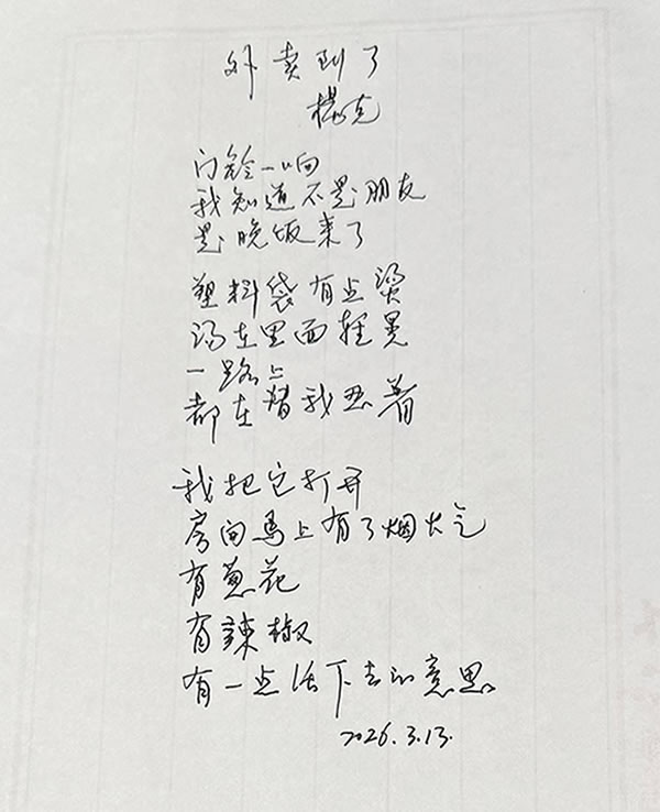 赵思运传来的照片,伊沙选的诗: 外卖到了(外二首) ■ 杨克 门铃一响 我知道不是朋友 是晚饭来了 塑料袋有点烫 汤在里面轻晃 一路上 都在替我忍着 我把它打开 房间马上有了烟火气 有葱花 有辣椒 有一点活下去的意思 배달이 왔다 양극 초인종이 울리자 나는 친구가 아니라 저녁이 온 것을 알았다 비닐봉지는 조금 뜨겁고 안에 국물이 살짝 흔들린다 오는 내내 나를 대신해 참아 온 듯하다 나는 봉지를 열었다 방 안에 금세 밥 짓는 냄새가 퍼진다 파와 고추가 있고 조금이나마 살아갈 이유가 있다 姜梅花 洪君植 译 其实诗各有各的看法,比如伊沙没选的这两首口语,我自己挺喜欢: 手机 现在我们低头 不是认错 连月亮出来了 也得先拍一下 再抬头看它 凌晨两点 这个时候 楼已经很安静了 冰箱偶尔响 像一个老实人 小声说话 我没睡 也不是有多大心事 就是白天太满了 满得连自己 都挤不进去 到了夜里 人才慢慢空下来 供稿:原作者 | 编辑:牧 野 |