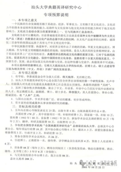 典籍外译研究学科方向的形成和发展 卓振英 典籍外译赋予典籍以新的生命形态与生存空间,有助于提高民族文化活力和东西方文明的融通互鉴,是“为天地立心,为生民立命,为往圣继绝学,为万世开太平”的伟业。开展典籍外译顺乎历史潮流和时代诉求,可谓顺天承命。 中国学者和外国汉学家翻译中国典籍的历史悠久。有的译者也会在前言或后记中谈及自己的体会和感想,但零星而不成体系。 我本人乃芸芸众生之中一名普通教师,既无足踏政、学两界的本领,也无身兼地、校多职的才干,只不过忽闪过一抹思想火花而已。我在2001年9月初向汕头大学校长办公会议提出建立典籍英译研究中心的建议,建议得到采纳,9月21日中心成立。 右起:科研主管校长吴光国教授、文学院院长于贤德教授、研究中心主任卓振英教授 9月23日,我在全国中译外研讨会(西安,2001)宣读与会论文“典籍英译:问题与对策”。论文提出的对策之一便是建立全国典籍英译研究会。 为了建立全国性研究团体,我给校长办公会议和中国英汉语比较研究会打了报告,同时努力取得刘重德教授(中国英汉语比较研究会首任会长)、杨自俭教授(中国英汉语比较研究会会长)、潘文国教授(英汉语比较研究会副会长)等学术界知名人士的支持。 2002年全国典籍英译研究会成立,汪榕培、卓振英、李正栓分别当选会长、副会长。根据杨自俭教授的提议,会议决定编撰论文选,由汪担任主编,由卓担任副主编,由李担任执行主编。嗣后卓振英被排挤在编撰人员之外,论文集没有收录其与会论文“典籍英译:问题与对策”。不过论文于2002年在某刊物公开发表,其引用率不低。 2002年卓振英当选中国英汉语比较研究会常务理事,兼任英汉语比较研究会新建立的典籍英译学科组(后改称典籍英译学科委员会)副组长。 二十几年来,看到青年学者茁壮成长,看到典籍外译蔚为大观,看到一个全新的学科方向从成形到发展壮大,看到自己的思想和策略因享有天时地利人和而得以在全国推行,任何来自学术宗派主义的屈辱、钳制、排斥和边缘化所产生的不快都烟消云散。上善若水、利物不争是人生的最高境界,朝着这个方向迈出的每一步都将获得灵魂得到净化和升华的幸福感,这种幸福感不是权势、地位、金钱所能换取的。 新时期的典籍外译是经世致用治学理念的体现,它毕竟是中国翻译史绕不开的一页,但何人写史、如何治史尚未可知。兹提供若干史料碎片,抑或有助于有关人士之明鉴云。 供稿:原作者 | 编辑:牧 野 |